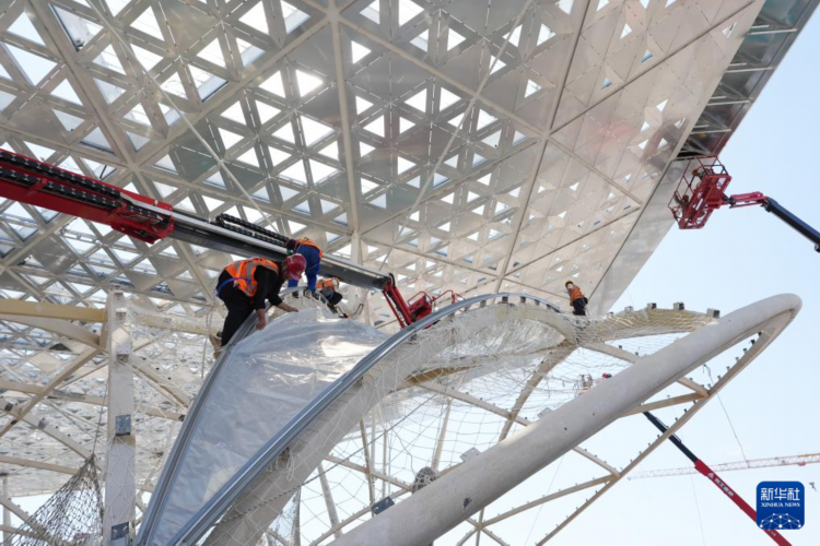 6月12日,在北京城市副中心站综合交通枢纽工程施工现场,北京城建集团的施工人员在安装ETFE气枕膜。