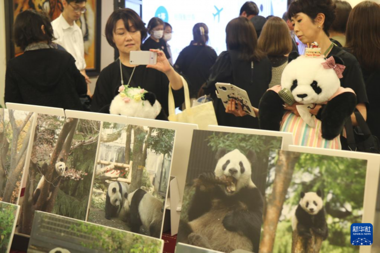 6月12日,在日本东京中国文化中心,观众在“大熊猫‘香香’家族生日会”现场拍照留念。