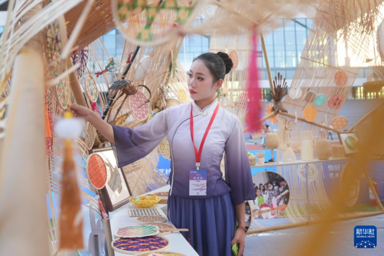 6月12日,参演学生参观湖北科技学院展出的竹编工艺品。