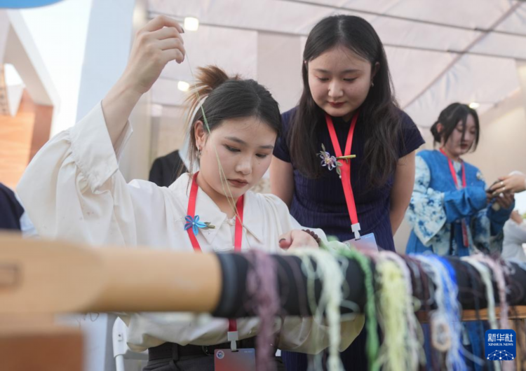 6月12日,武汉纺织大学学生在展示汉绣工艺。