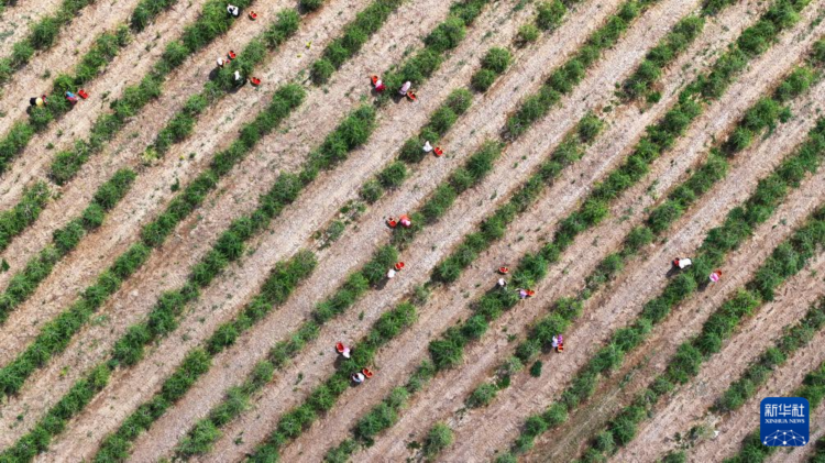 6月12日,采摘工在枸杞地里采摘枸杞(无人机照片)。
