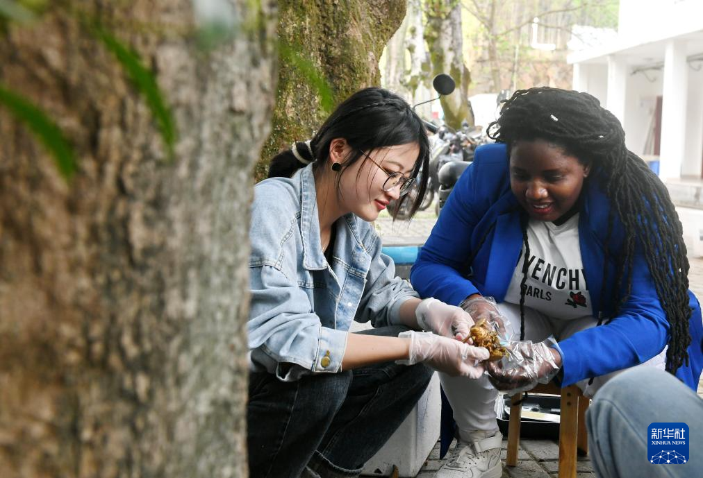 2024年3月28日,在位于福州的福建农林大学,来自卢旺达的梅迪在国家菌草工程技术研究中心向中国学生嘉欣瑶了解“绿洲3号”菌草品种。 新华社记者 林善传 摄