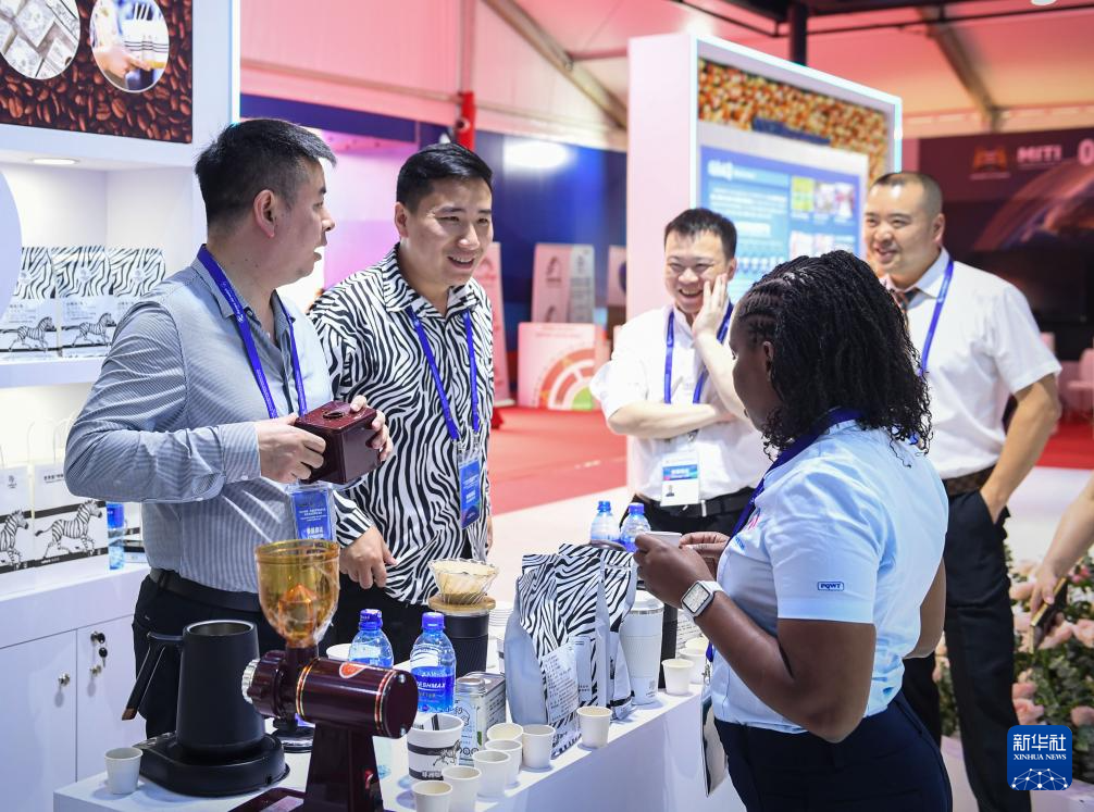 2024年5月9日,参展商在肯尼亚首都内罗毕举办的中非经贸博览会走进非洲巡展上推销咖啡产品。 新华社记者 李亚辉 摄