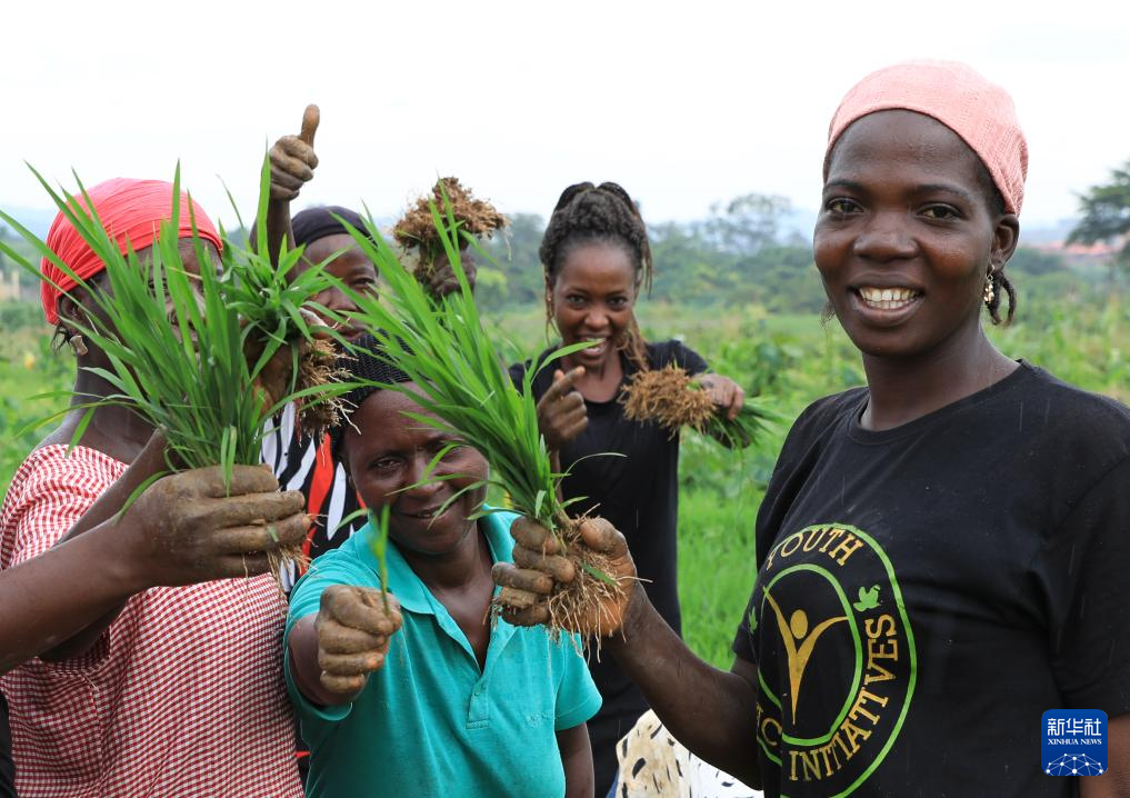 2023年9月19日,当地员工在尼日利亚阿布贾的中国援尼日利亚农业技术示范中心展示秧苗。 新华社记者 董江辉 摄