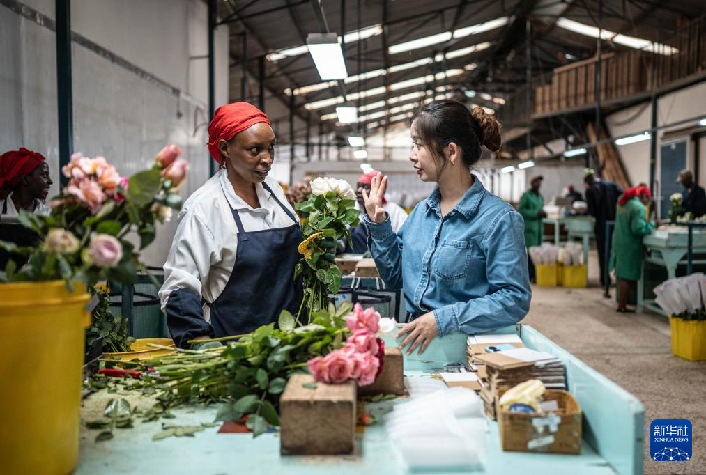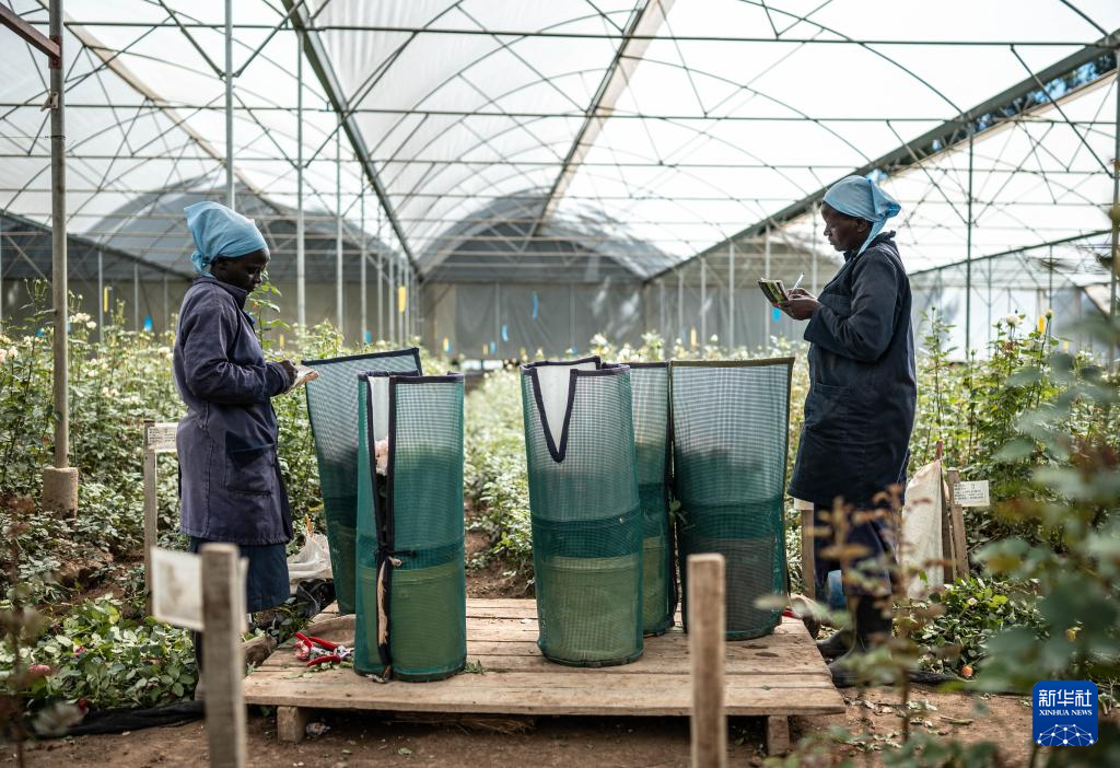 2024年5月18日,湖南玺悦国际贸易有限公司负责人黄梓楠(右)在肯尼亚纳纽基的坦布济花卉农场挑选鲜花。 新华社记者 王冠森 摄