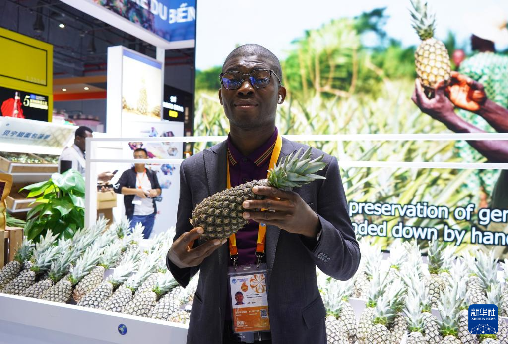2023年11月8日,在第六届进博会食品及农产品展区贝宁菠萝展台,工作人员爱力舍展示贝宁菠萝。这是贝宁菠萝第一次参加进博会。 新华社记者 金皓原 摄