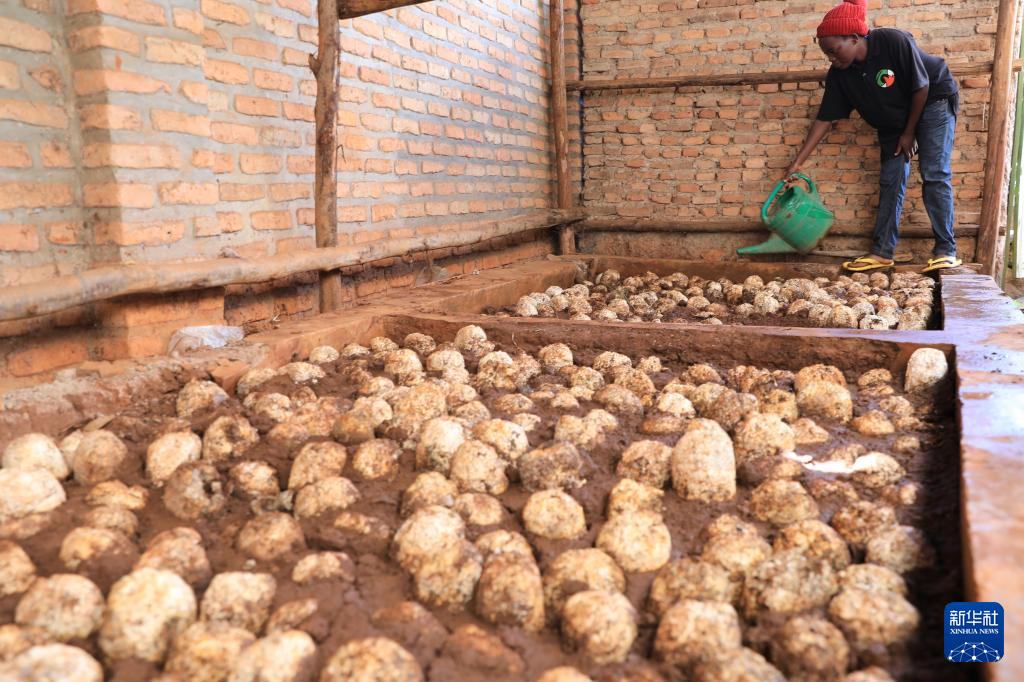 2024年4月5日,在卢旺达首都基加利的卡布耶地区,一名工人在工坊给栽种的菌袋浇水。 新华社记者 董江辉 摄