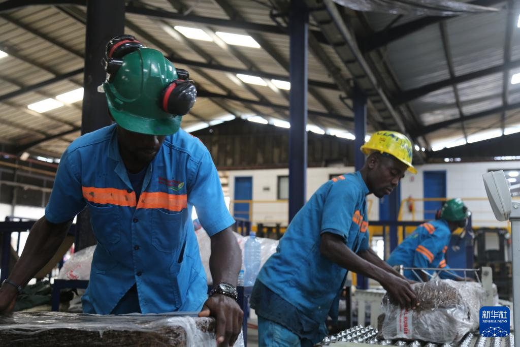 2024年6月10日,在科特迪瓦南部城镇达布郊区,工人们在美兰橡胶加工厂对成品橡胶进行打包。 新华社记者 张健 摄