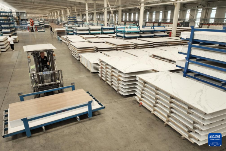 6月13日,工人在卢龙县一家环保型建设材料企业的生产车间工作(无人机照片)。