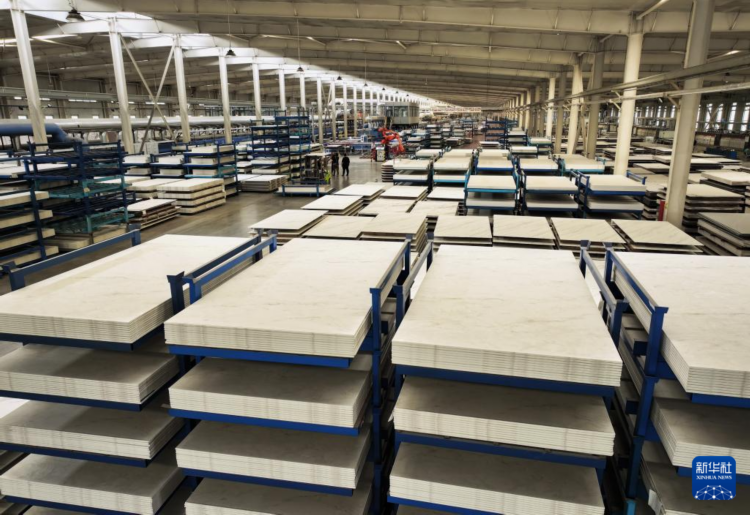 6月13日,工人在卢龙县一家环保型建设材料企业的生产车间工作(无人机照片)。