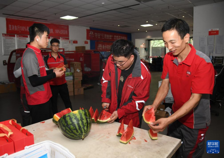 6月13日,快递员在西安市碑林区一处京东快递站点品尝西瓜。