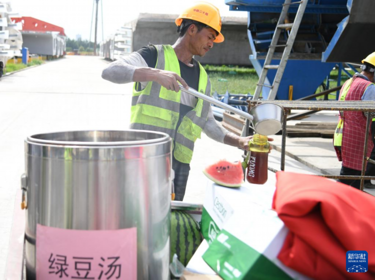 6月12日,在位于西安市灞桥区的西延高铁灞桥制梁场,中铁二十局的工人领取绿豆汤。