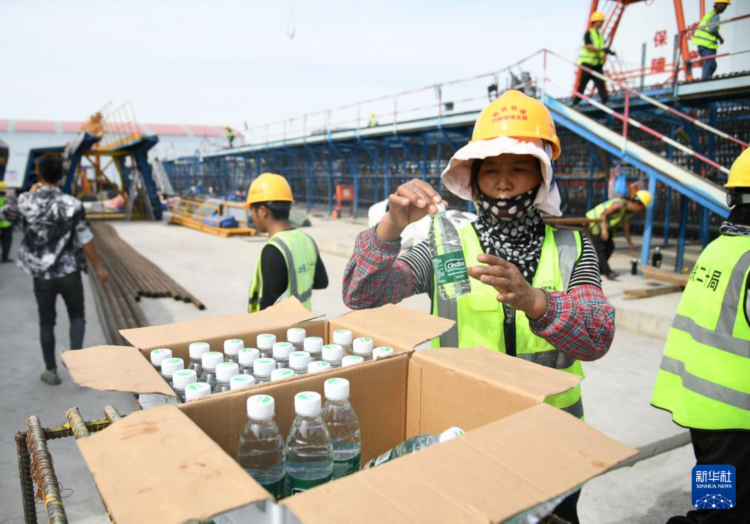 6月12日,在位于西安市灞桥区的西延高铁灞桥制梁场,中铁二十局的工人领取饮用水。