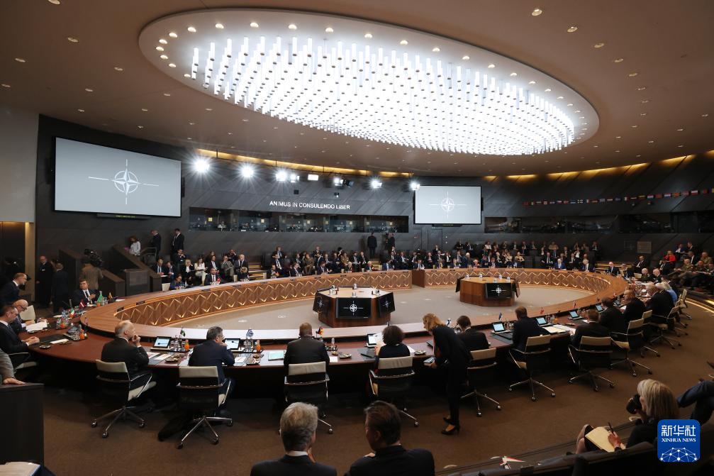 这是6月14日在比利时布鲁塞尔北约总部拍摄的北约防长会现场。新华社记者 赵丁喆 摄