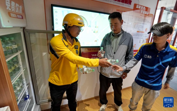 6月16日,外卖配送员、快递员在工会驿站内拿取免费冷饮。