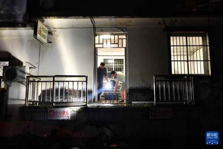 6月15日,武夷山水文站水文勘测人员夜晚利用探照灯观察崇阳溪水情。