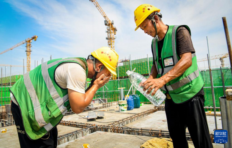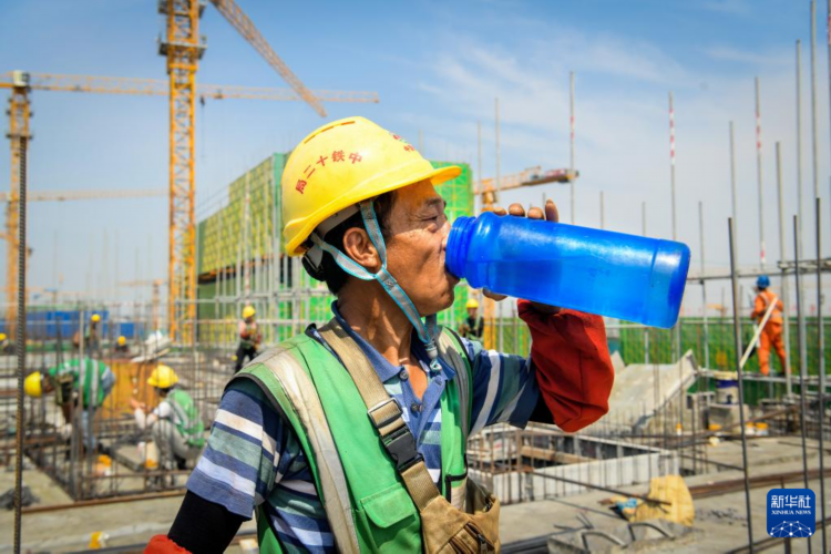 6月18日,中铁十二局工人在河北雄安新区大河片区安置房项目建设现场喝水解暑。