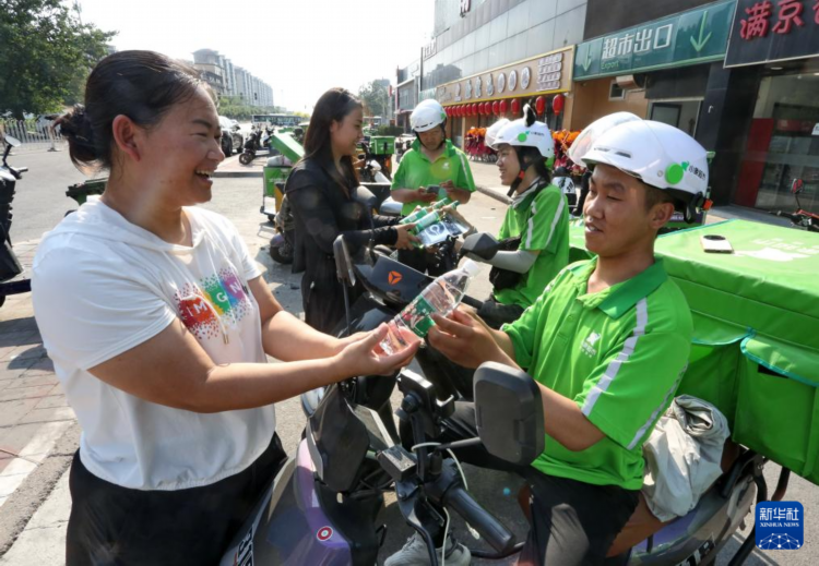 6月18日,北京市丰台区南苑街道的工作人员在街头为餐饮配送员送上冰镇矿泉水等。