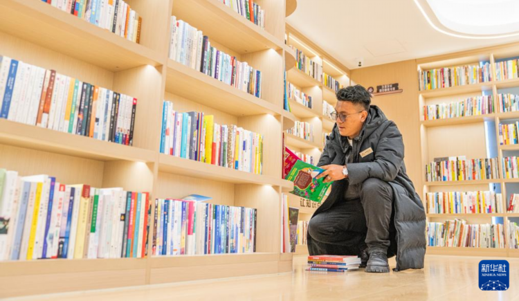 “温暖嘉·色尼城市书房”管理员白玛扎西正在整理书籍(6月17日摄)。