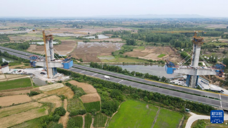 这是新建沪宁合高铁跨沪陕高速公路特大桥主桥塔柱封顶施工现场(6月18日摄,无人机照片)。