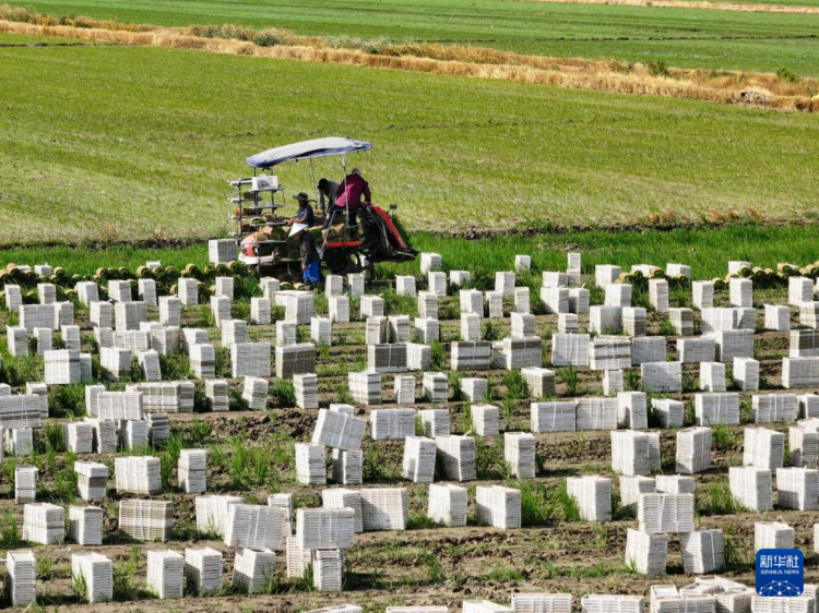 6月18日,起秧工将秧苗放到插秧机上(无人机照片)。