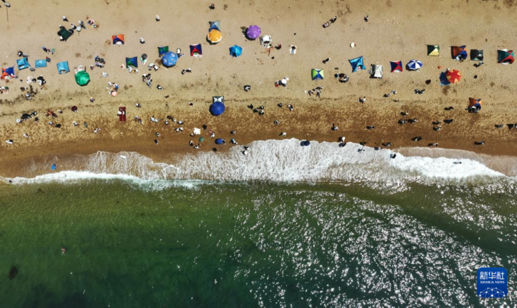 6月17日,游客在辽宁大连傅家庄海滨浴场游玩(无人机照片)。