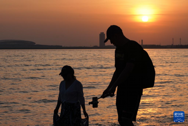 6月12日傍晚,游人在辽宁营口辽河入海口观赏夕阳入海。