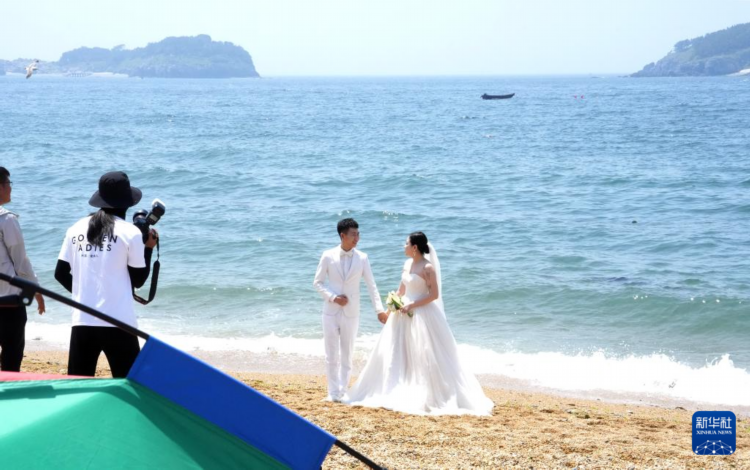 6月17日,一对新人在辽宁大连傅家庄公园的海边拍婚纱照。