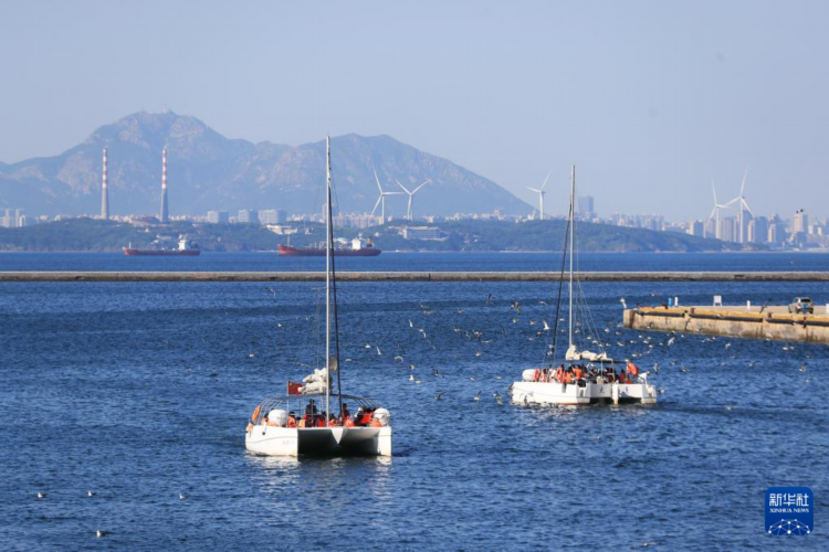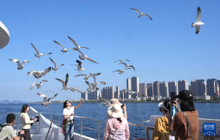 6月16日,游客在辽宁大连东港商务区附近海边乘船出海游玩。