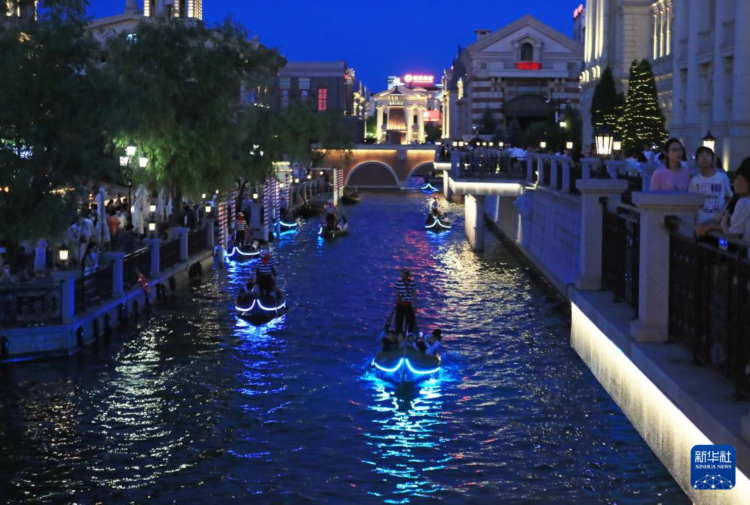 6月15日,在辽宁大连东方水城景区,游客乘船游玩。