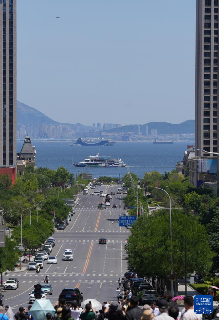 6月19日,人们在辽宁省大连市港东五街拍摄街道直通大海的景色和远处经过的轮船。