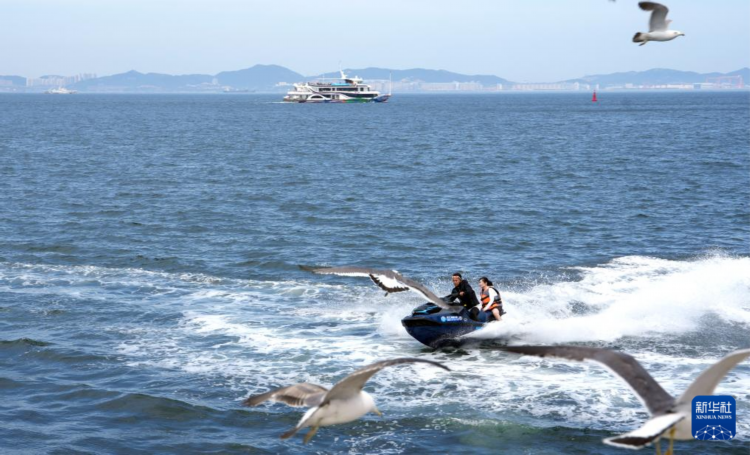 6月19日,游客在辽宁大连东港商务区附近海域乘坐摩托艇出海游玩。