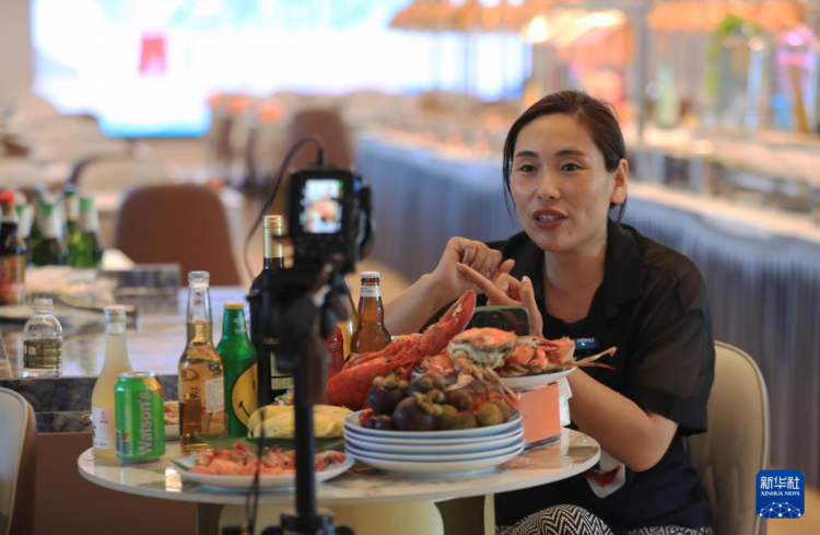6月16日,在“老虎滩”号游船上,工作人员在直播介绍“海上游大连”项目。