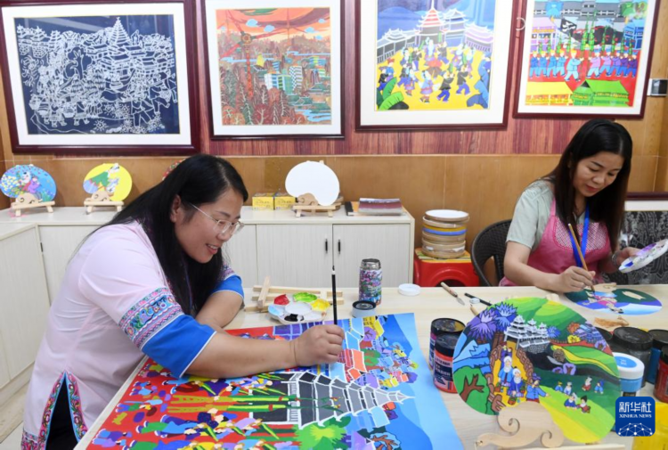 6月19日,在广西三江侗族自治县侗画馆,侗族农民画作者在创作。