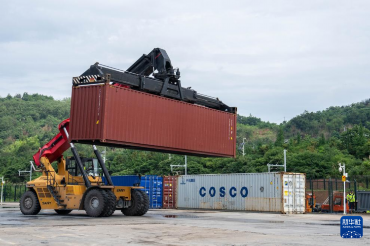 6月20日,在株洲中车物流园,工作人员在进行集装箱装车作业。
