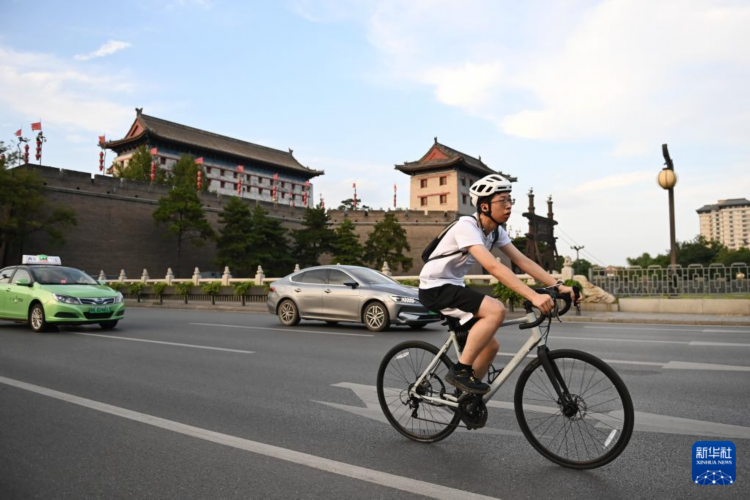6月18日,骑车锻炼的市民经过西安城墙永宁门。