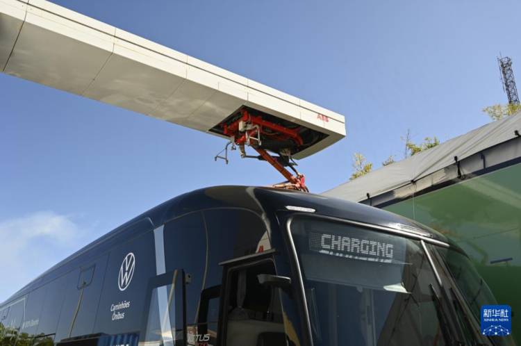 6月19日,在巴西阿拉沙市,一种应用新型快充锂电池技术的大巴在发布会现场充电。