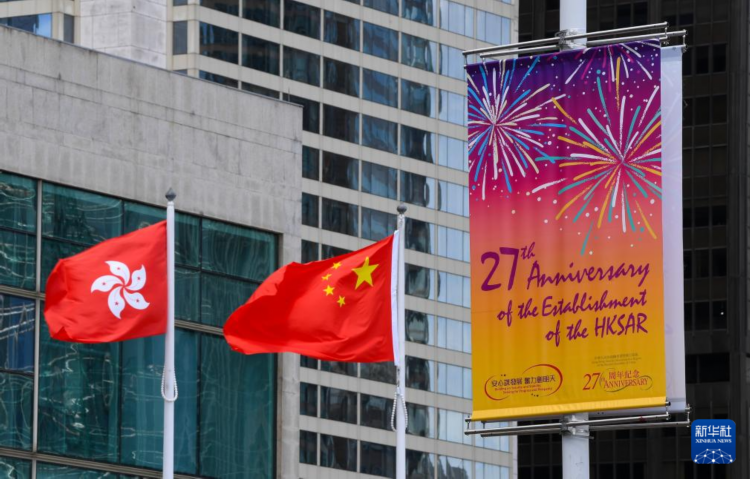 随着香港回归祖国27周年纪念日临近,香港街头悬挂国旗、区旗,张贴庆祝海报,喜庆气氛日渐浓厚。