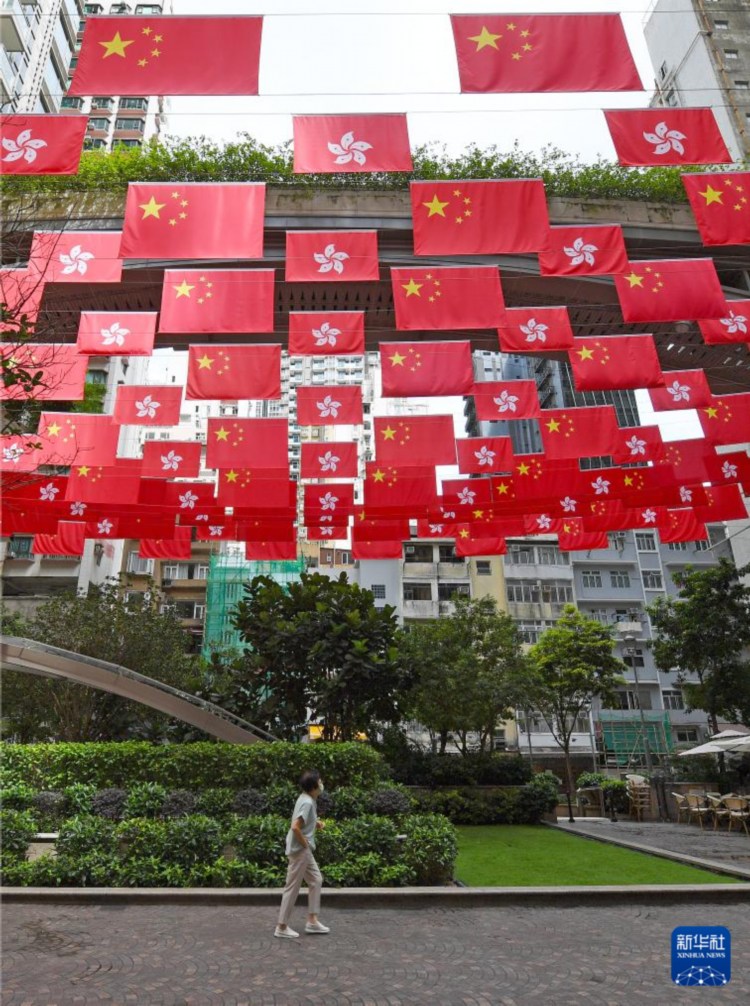 香港利东街悬挂着五星红旗和紫荆花区旗(6月23日摄)。