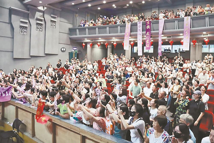 晚上7点半,《柳永》终于亮相。当饰演柳永的王君安登场时,剧场爆发雷鸣般的掌声。作为“人民艺术家”尹桂芳先生的嫡传弟子,她在《柳永》中唱腔清越婉柔,一个眼神一个身段都流露大家风范,让全场戏迷看得如痴如醉。