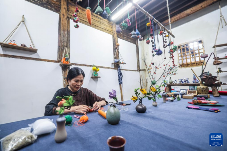 6月25日,民间艺人在郑店村婺剧非遗主题馆旁的特色非遗集市展示当地手工技艺和手工艺作品,这也是当地特色文旅项目。