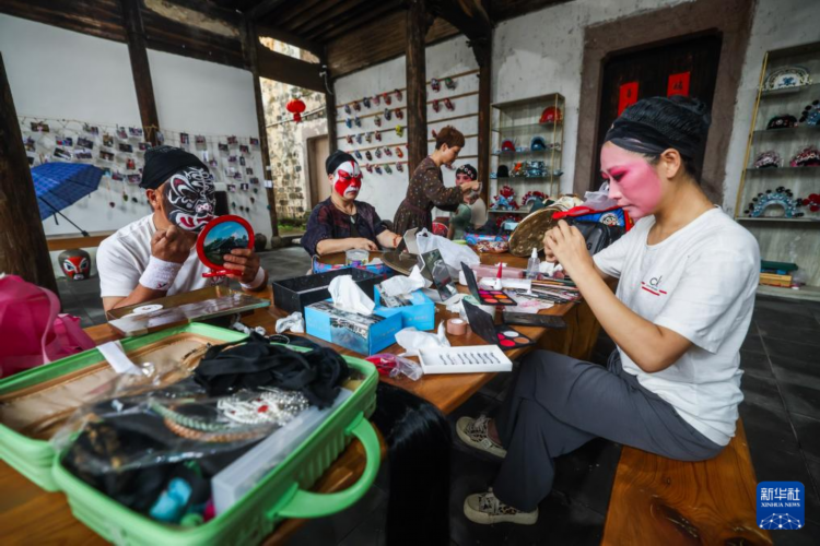 6月25日,澧浦镇郑店村婺之灵坐唱班的婺剧演员在古民居大厅内的后台为演出做准备。
