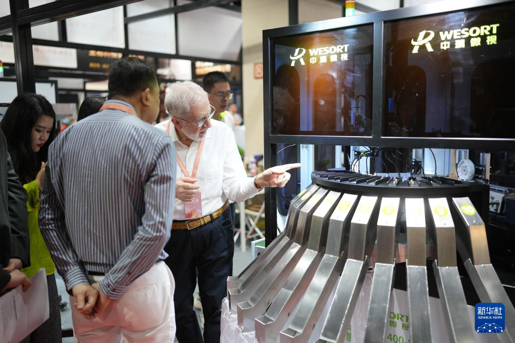 5月20日,在浙江省诸暨市举行的世界珍珠大会上,加拿大籍客商在了解一款由中国公司自主研发的AI珍珠精选机。 新华社记者 翁忻旸 摄