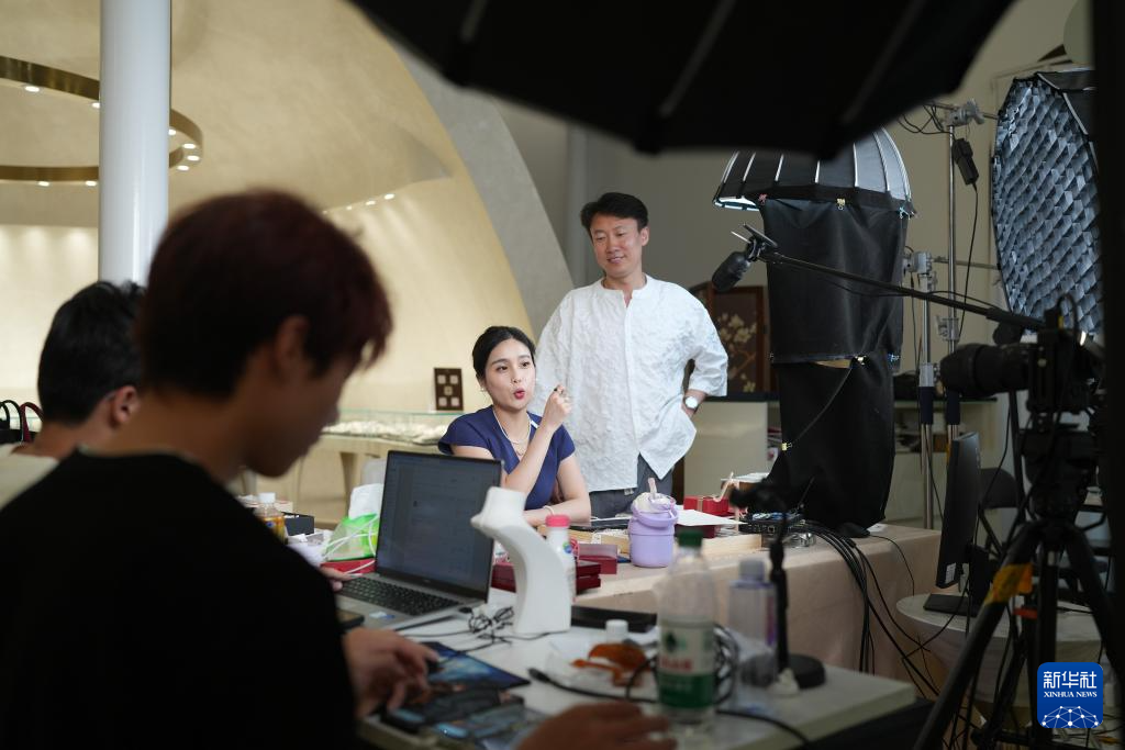 5月20日,在浙江省诸暨市一家珍珠企业的展厅,主播在介绍珍珠饰品。新华社记者 翁忻旸 摄
