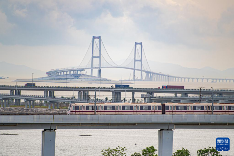 6月19日,深圳地铁11号线列车和广深沿江高速上的车辆经过深中通道的深中大桥和西人工岛。