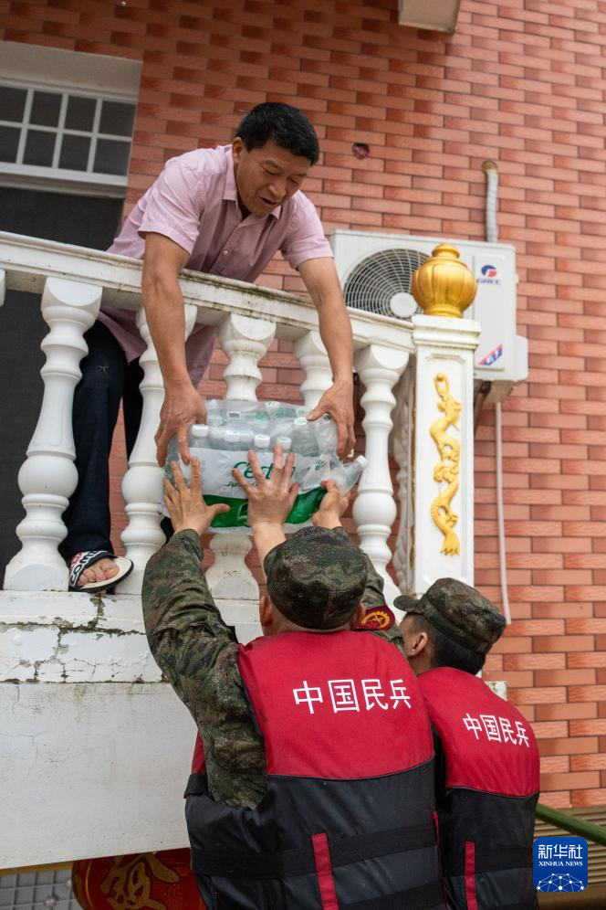 7月1日,在平江县天岳街道大西村,民兵给被困群众运送救援物资。
