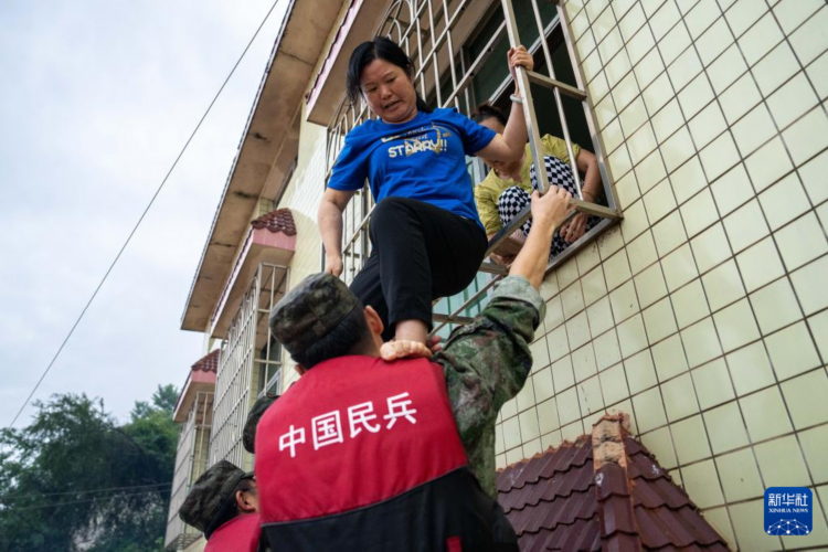 7月1日,在平江县天岳街道大西村,民兵在转移群众。