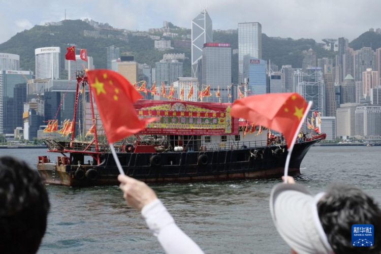 当日,香港渔民团体联会的渔船在维多利亚港巡游,庆祝香港回归祖国27周年。