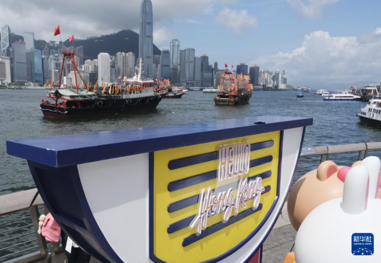 当日,香港渔民团体联会的渔船在维多利亚港巡游,庆祝香港回归祖国27周年。