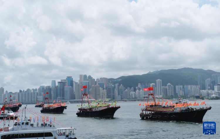 当日,香港渔民团体联会的渔船在维多利亚港巡游,庆祝香港回归祖国27周年。
